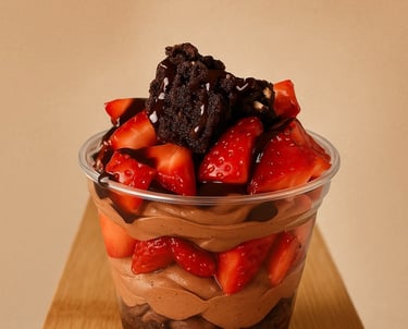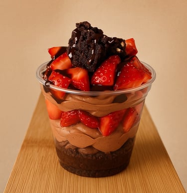 Fudgy brownie, creamy chocolate mousse, and fresh strawberries. Irresistibly delicious in every layer.