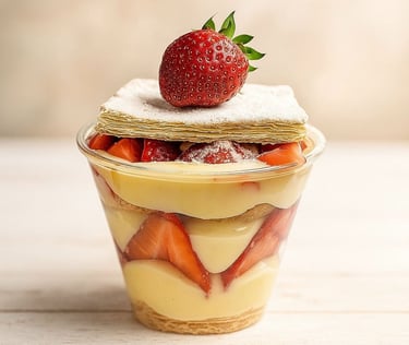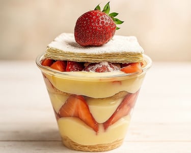 Delicate layers of puff pastry, vanilla custard, and fresh strawberries. A light, silky, and completely irresistible treat.